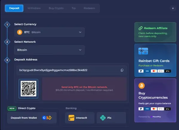 Rain Bet runs a crypto-first cashier while also offering card and bank transfer options in EUR for UK players. Available deposit methods include cryptocurrency (BTC, ETH, LTC, USDT, USDC, BCH), Visa/Mastercard via a third party, and bank transfer via a third party. The minimum deposit is €30. Crypto and card deposits are instant; bank transfers take 1–3 days. Rainbet does not add platform fees, though network or provider charges may apply independently.
