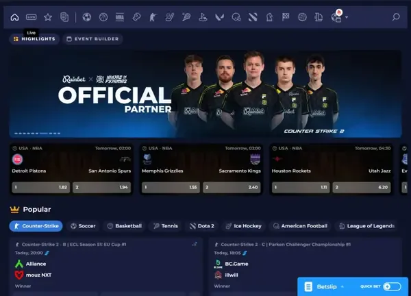 Esports is available for players who follow competitive gaming, with coverage that typically includes major titles such as CS:GO/CS2 and League of Legends, plus events that vary by calendar. Market depth depends on the match level, but you can expect core outcomes and map-based options on many fixtures. If you want one account that supports both casino and sport, casino Rainbet is structured to keep both areas easy to reach from the main menu.